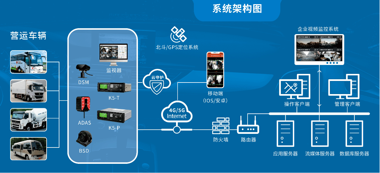 远程定位监控、实时高清视频监控及传输、VOIP语音对讲、超速报警、驾驶员状态检测报警(疲劳驾驶、分神/抽烟/打电话、遮挡摄像头报警、玩手机检测、安全带检测等)、高级驾驶辅助系统报警(车道偏离报警、车距过近报警、前向碰撞报警等)、可选倒车影像、转向灯触发影像、四方位影像。