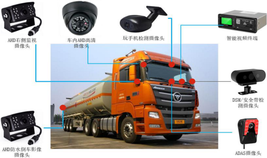 设:主动安全智能视频摄像头ADAS、DSM、HOD、BSD、声光报警器、显示屏等