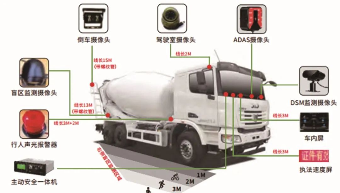 罐体正反转监控、反转圈数统计、非法卸料报警、区域监控、倒车影像、执法监测屏、通行证显示、驾驶员身份识别、超速报警、驾驶员状态检测报警、高级驾驶辅助系统报警、右侧盲区监测、行驶路线监控、VOIP语音对讲、油耗管理、智能调度、电子围栏、搅拌站/工地管理等。