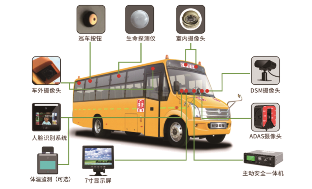 学生上下车人数统计(RFID卡/红外感应)、学生上下车短信通知、超员报警、滞留人员报警、紧急报警、视频监控、实时视频传输、VOIP语音对讲、行驶路线监控、分段限速、超速提醒、疲劳驾驶报警、驾驶员身份识别、手机APP、人脸识别、体温监测、司机巡检、紧急报警、车辆定位跟踪、主动安全。